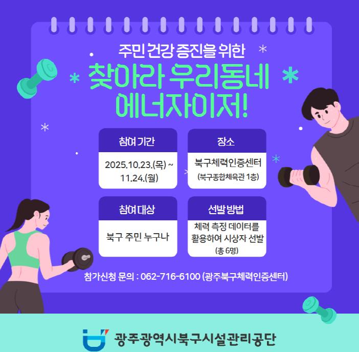[나이스데이]광주광역시북구시설관리공단은 지역 주민들의 체력 증진과 건강한 생활 습관 형성을 위해 ‘찾아라 우리동네 에너자이저!’ 2기 선발대회를 개최한다고 밝혔다.