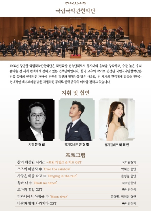 공연의 지휘는 국립국악관현악단 악장을 역임하고 현재 중앙대학교 전통예술학부 교수인 문형희 지휘자가 맡으며 뮤지컬 배우 윤형렬, 박혜민이 출연해 맑고 따뜻한 음색으로 사랑과 희망의 메시지를 전달할 예정이다.