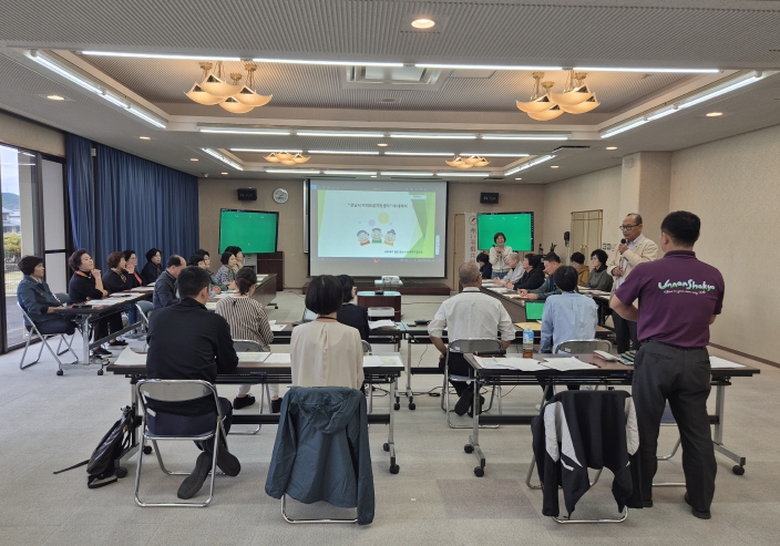 강진군 직원들이 일본 운난시 지역포괄케어센터에서 지역포괄케어 시스템에 대하여 설명을 듣고 있다.