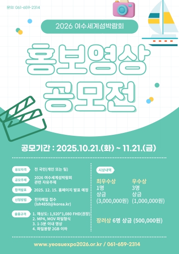 [나이스데이](재)2026여수세계섬박람회조직위원회가 11월 21일까지 ‘2026여수세계섬박람회 홍보영상 공모전’을 개최한다.