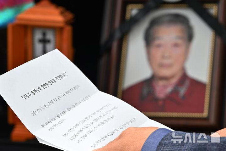[나이스데이] 이국언 일제강제동원시민모임 상임대표가 7일 오후 광주 북구 영락공원묘지에서 일제 강제노역 피해자 고(故) 김성주 할머니를 향한 추모의 글귀를 읽고 있다. 김 할머니는 지난 5일 숙환으로 별세했다. 2024.10.07. leeyj2578@newsis.com