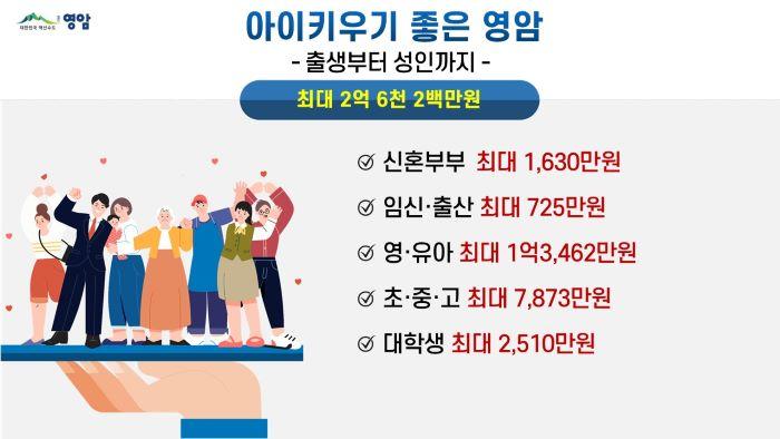 ‘영암 아이 종합계획’에 따라 영암군은 아이 1명의 성장 단계별로 다양한 지원을 한다. 구체적으로 신혼부부에게 1,630만원, 임신·출산가정에 725만원, 0~6세에게 1억3,462만원, 초·중·고 학생에게 7,873만원, 대학생에게 2,510만원을 지급한다. 각 지원금은 최대치다.