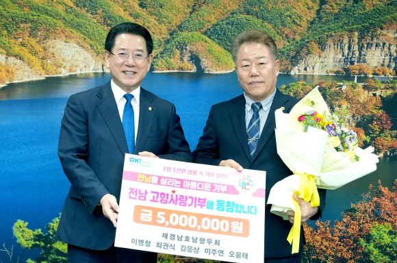 [나이스데이]재경남호남향우회가 23일 전남도청을 찾아 고향사랑기부금 500만 원을 기탁하는 등 고향사랑의 마음을 전달했다.