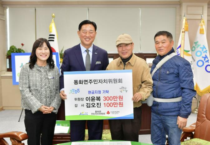 군에 따르면 최근 동화면 주민자치위원회에서 이윤복 위원장이 300만 원, 김오진 감사가 100만 원을 장성군에 기부해 이목을 끌었다. 이윤복 위원장은 “올해 처음 위원장을 맡아 활동하면서 이웃을 돕고 싶은 마음에 기부를 결정했다”고 밝혔다. 김오진 감사는 5‧18민주 유공자 생활안정지원금을 1년간 적립해 기부를 실천한 것으로 알려져 그 의미를 더했다.