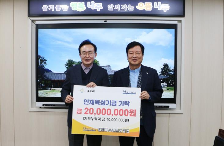 [나이스데이]전라남도 나주시는 다도면에 위치한 해피니스컨트리클럽(주) 양진석 회장이 5일 지역인재육성기금 2천만원을 (재)나주교육진흥재단에 기탁했다고 밝혔다.