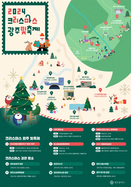 광주시청 잔디광장 크리스마스스윙, 광주 송정역 광장 크리스마스트리, 광주시립수목원 전시온실 크리스마스트리, 북구청 광장 크리스마스 야간경관, 운천저수지 크리스마스트리, 광주신세계백화점 야간경관 등 광주 곳곳이 아름다운 조명과 포토존으로 꾸며진다.