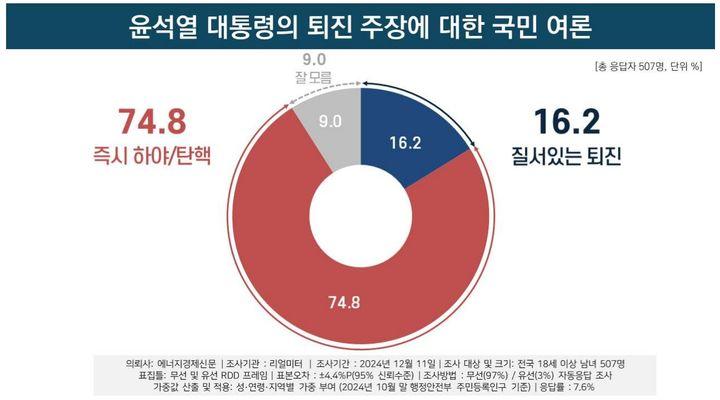 윤 대통령 '즉시 하야·탄핵' 74.8%, '질서있는 퇴진' 16.2%[리얼미터]
