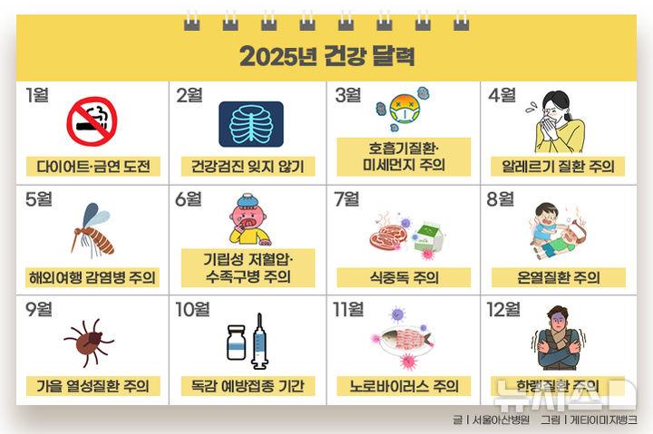 [나이스데이] 푸른 뱀의 해인 을사년(乙巳年) 새해가 찾아왔다. 월별 주의 사항을 익혀 질환과 사고 발생을 예방하고, 건강검진으로 혹시 놓칠 수도 있는 질환을 조기 발견해 치료한다면 한 해를 건강하게 보낼 수 있다. 10일 손기영 서울아산병원 가정의학과 교수를 통해 월별로 지켜야 할 건강 수칙을 정리했다.