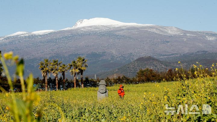 [나이스데이] 맑은 날씨를 보인 11일 오전 제주 한라산 만설 아래로 대표적인 봄꽃인 노란 유채꽃이 활짝 펴 시선을 사로 잡고 있다.